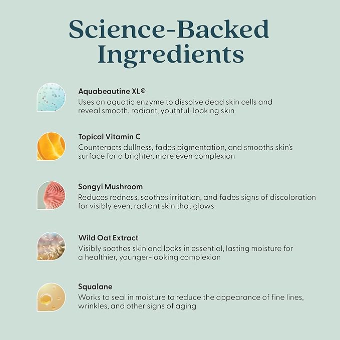 • VISIBLY REDUCES DISCOLORATION AND BRIGHTENS COMPLEXION - Natural brightening agents like mushroom extract and advanced exfoliants like Aquabeautine XL work synergistically to fade the appearance of dark spots, blotchiness, and hyperpigmentation. The result is bright, radiant, more evenly-toned skin that glows.