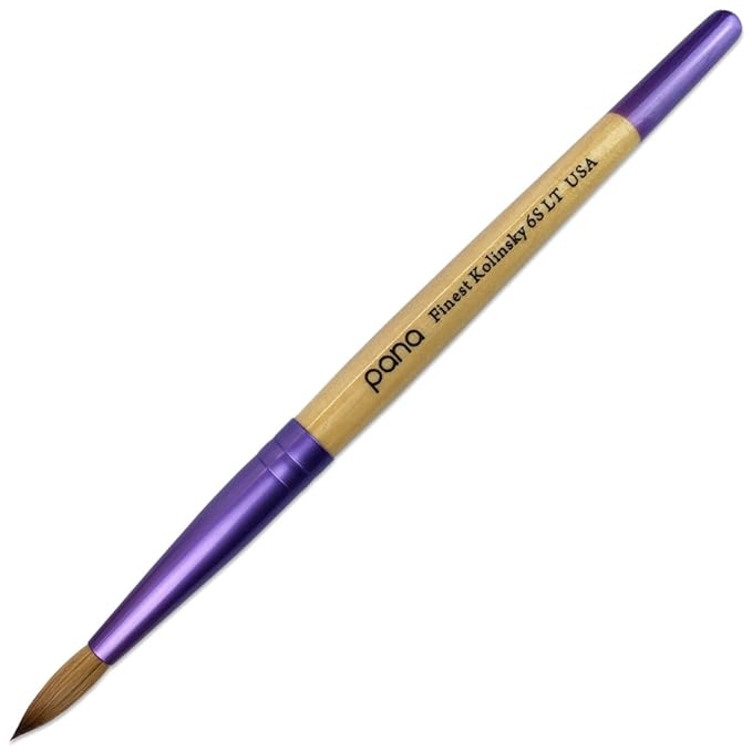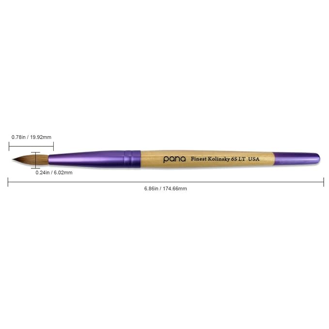 • [Design] Size 6 Round Brush Handle | A smooth and sturdy beige hardwood handle painted with purple sturdy alloy crimped ferrule that holds the pure Kolinsky hair firmly to prevent splitting or deformation of the hairs. Weighted just right, the brush is made to provide full comfortability for all nail techs to hold.