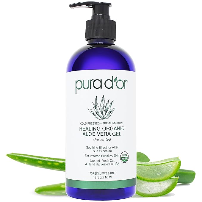 PURA D'OR 16 Oz ORGANIC Aloe Vera Gel - Unscented - All Natural - ZERO Artificial Preservatives - Deeply Hydrating & Moisturizing - Sunburn, Bug Bites, Rashes, Small Cuts, Eczema Relief - Skin & Hair