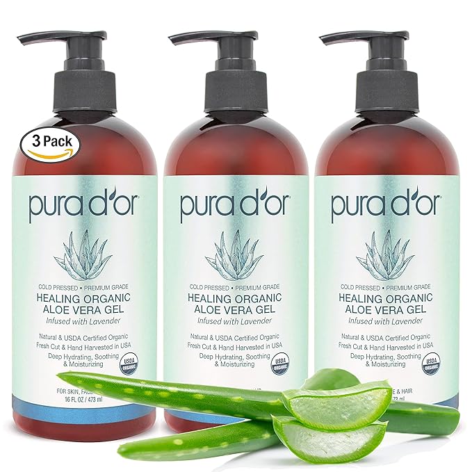 PURA D'OR ORGANIC Aloe Vera Gel Lavender (16 Oz X 3) All Natural - ZERO Artificial Preservatives - Deeply Hydrating & Moisturizing - Sunburn, Bug Bites, Rashes, Small Cuts, Eczema Relief - Skin & Hair