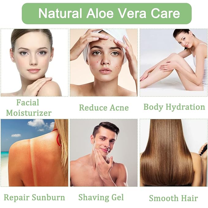 • REPAIR DAMAGED SKIN: Aloe vera gel can repair dry skin, heal minor wounds and sunburns, instantly relieve facial redness, and can also help speed up the natural healing of damaged skin such as acne, scars, razors, minor burns