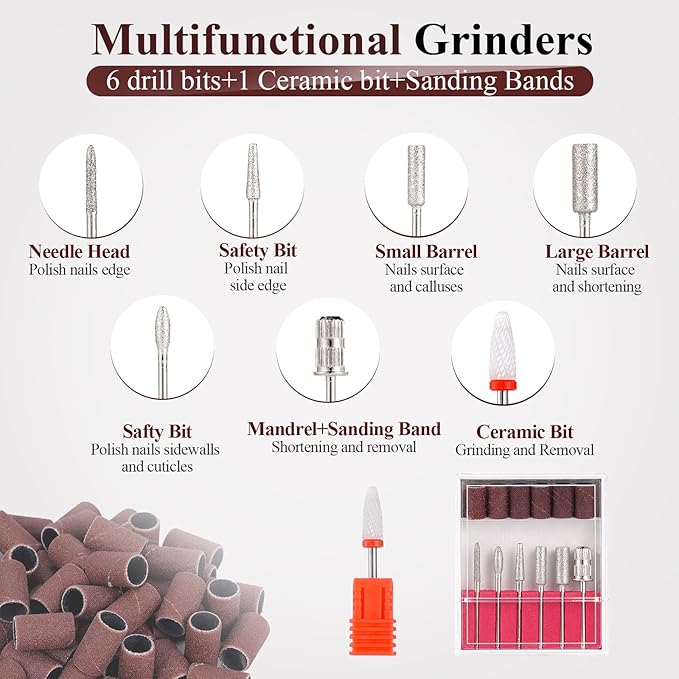 • 【Multifunctional Nail Kit】Electric nail drill awesome for nail buffing, filing the shape of various nails, and smoothing calluses or hardened skin on your hands and feet. Designed with 6 kinds of metal bits and 6 sanding bands (also works with all kinds of 3/32” shank bits).