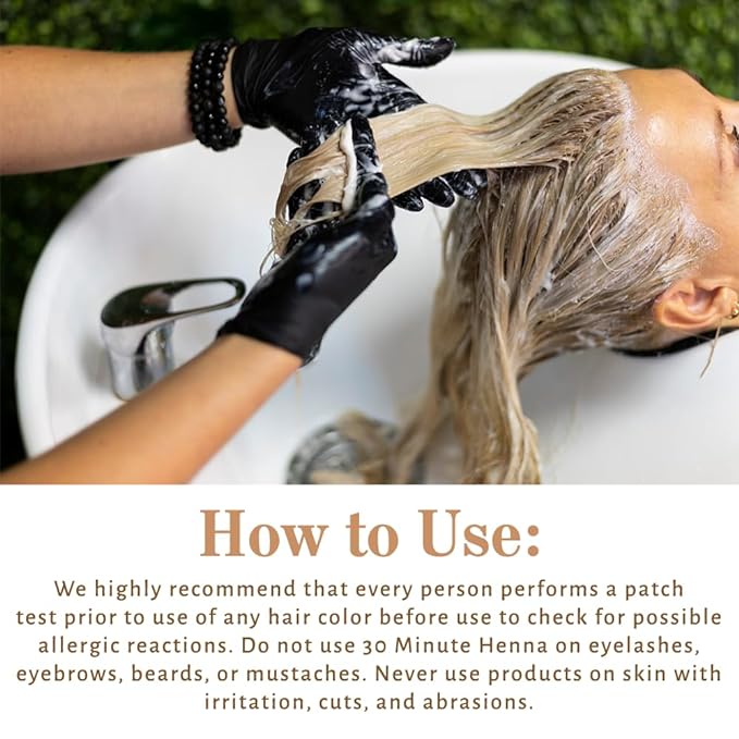• RECOMMENDED: We highly recommend that every person performs a patch test prior to use of any and all hair color before use to check for possible allergic reactions. Do not use 30 Minute Henna on eyelashes, eyebrows, beards, or mustaches. Never use product on skin with irritation, cuts, and abrasions.