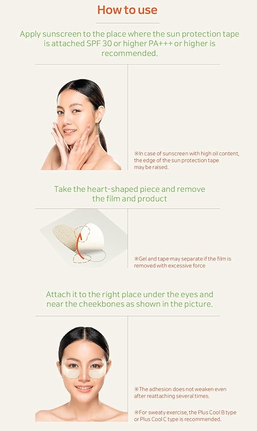 • 🌈 HOW TO USE : Apply sunscreen to the place where the sun protection tape is attached SPF 30 of higher PA+++ of higher is recommended. Take the heart-shaped piece and remove the film and product. Attach it to the right place under the eyes and near the cheekbones as shown in the picture. (3.35inch * 1.38inch / 8.5cm * 3.5cm)