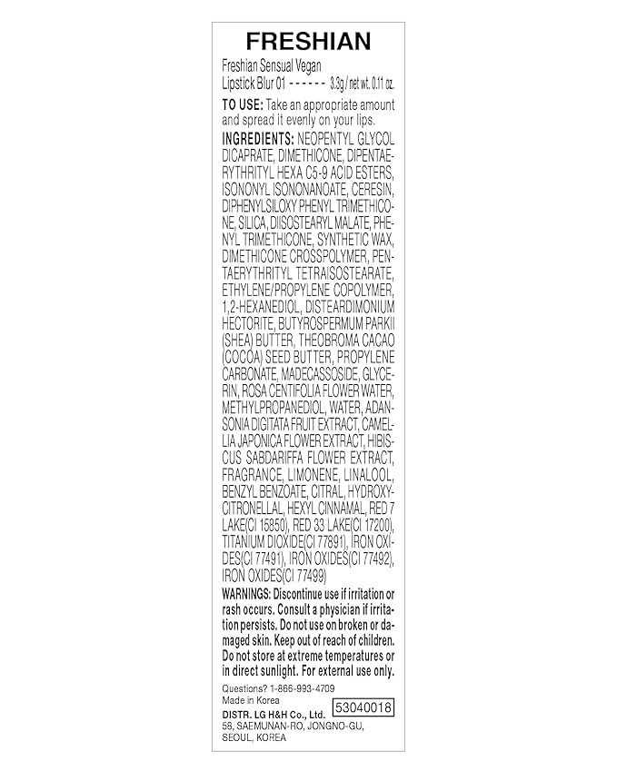 • FRESHIAN SENSUAL VEGAN LIPSTICK BLUR (01 Pleasure, 3.3g/0.12oz) - This lipstick provides a matte, yet smooth, lightweight finish that enhances your natural beauty while keeping your lips nourished and comfortable all day. Enriched with Flower Complex, a blend of hibiscus, camellia, and Provence rose extracts, it ensures your lips stay lively and moisturized.