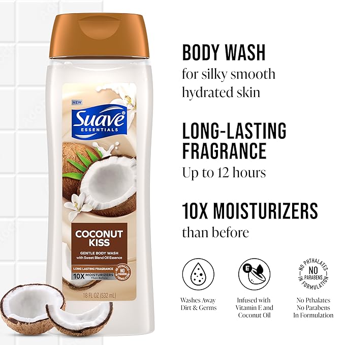 • MOISTURIZING BODY WASH: The creamy lather of each Suave Body Wash, featuring Sweet Blend Oil Essence, gently smooths and softens skin naturally without parabens or phthalates.