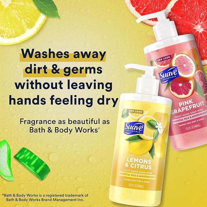 • CITRUS HAND SOAPS: Suave Essentials has created liquid hand soaps that are so effective and beautifully fragrant, you’ll be happy to wash your hands over and over again.