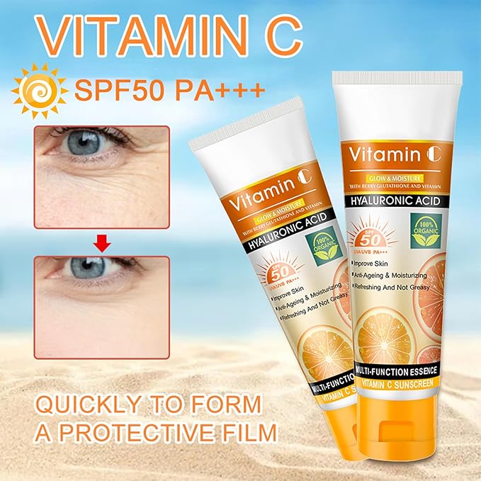 • 【NOT GREASY AND NOT STICKY】Vitamin C facial SPF 50 is easy to use, with light texture, no heavy feeling and no greasy feeling. Sun cream for face is rich in hyaluronic acid and vitamin C, providing instant skin barrier function, protecting and nourishing skin.