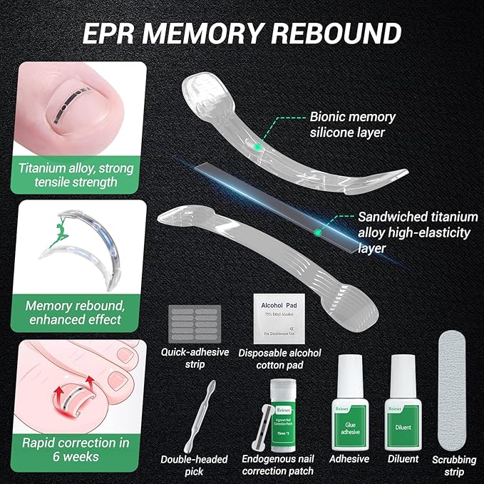 • 【Titanium alloy patented technology】 The patch is made using patented technology and titanium alloy, which has strong tensile strength and high toughness, and will not break even when bent 180°. In addition, the outer layer of bionic memory silicone allows the memory to rebound and quickly alleviate the inward growth of toenails