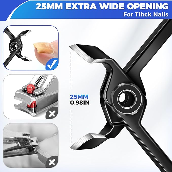 • IDEAL FOR THICK NAILS - The opening of thick toenail clippers is 6 times wider than the opening of normal nail cutter, and the wide jaws can be opened up to 25mm, so you can easily cut off thick and hard nails. Professional nail clippers are great for elderly, men, women and pet nails.