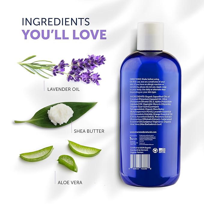 • NATURAL ORGANIC SOAP MADE IN USA - Our body wash is made from premium lavender and shea butter, which are well known for moisturizing skin plus the anti-inflammatory benefits of lavender. We added jojoba oil, coconut oil, and olive oil to moisturize, refresh, and deodorize. No parabens, preservatives, petroleum, sulfate, silicone, synthetic fragrances, or dyes. Made in the USA.