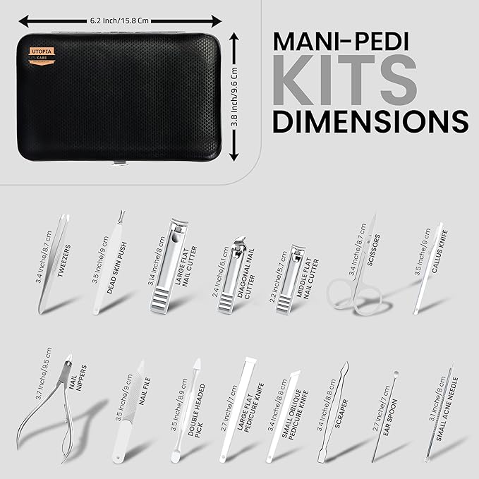 • 15 PCs MANICURE KIT- High quality, beautifully made manicure set; ideal for foot, hand and facial care. The set contains nail clippers for finger and toenails, peeling knives, cuticle trimmers, toenail nipper, nail file, v-shaped push stick, eyebrow tweezers, multi-purpose scissors, blackhead needle with loop remover and an ear pick