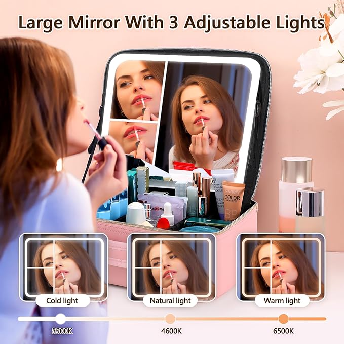 • 【Makeup case with led light】 We installed a makeup mirror with light on the make up bag. The led light has three colors that can be adjusted, namely white, yellow, and mixed color, and the brightness can be adjusted at any time. It is very suitable for use when making up, and has the charging function. It is especially suitable for travel without power supply.